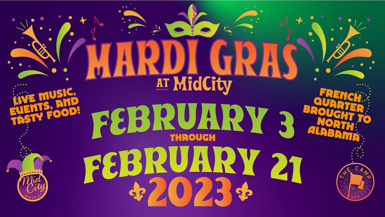“With 50 years of New Orleanian family roots, I’m honored to continue bringing that culture and tradition to Huntsville for ‘Mardi Gras at MidCity’ for the fourth year,” said Octo Hospitality Co-founder Jamie Munoz. “If I can’t be home for Mardi Gras then I want to bring that authentic atmosphere to The Camp to share the music, food and fellowship that define the celebration with thousands of our friends.”