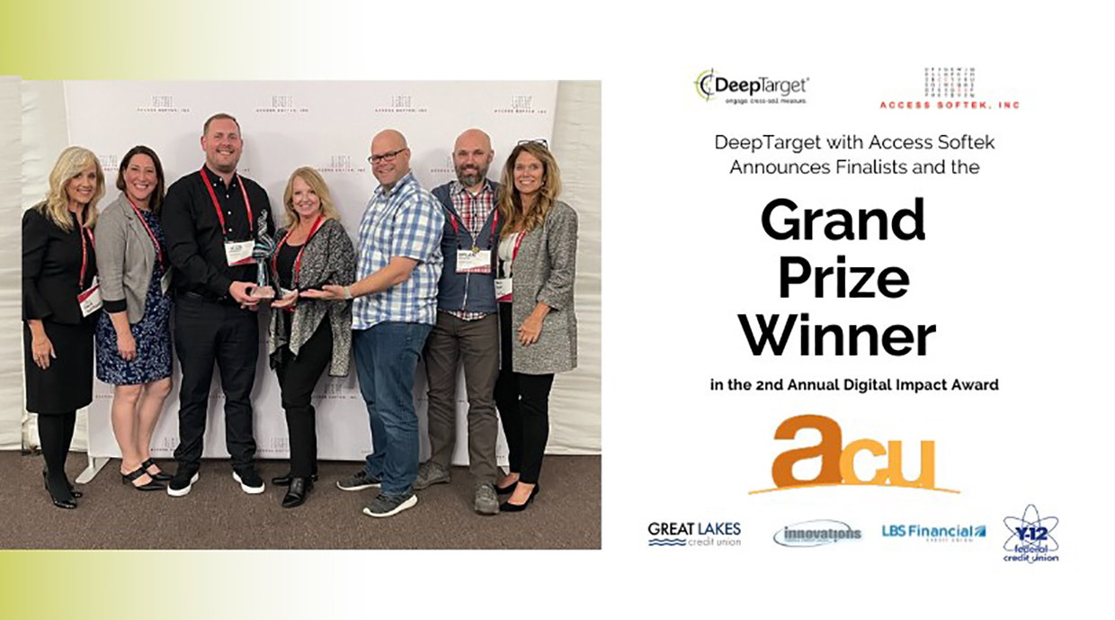 “Working with DeepTarget and Access Softek to strengthen our member relationships and increase revenue opportunities in today’s challenging environment has been a successful endeavor for our credit union,” said Kim Kingery, AVP of Support Services at America’s Credit Union. “We are honored to be recognized by our peers for our marketing efforts and look forward to future campaign results from our rewarding relationship with Access Softek and DeepTarget.”