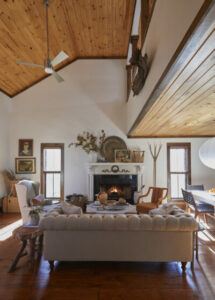 The main living room is a mix of warm-toned furniture, cozy throws, exposed beams, wide-planked wood floors, and eclectic art. A stone fireplace anchors the space, while a custom bar housed in an antique wardrobe provides spirits for guests to enjoy when evening rolls around.