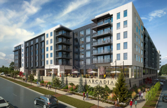 Arcadia will stand six stories tall with 12,000 square feet of office, 7,000 square feet of retail and restaurant, and 250 residential units.
