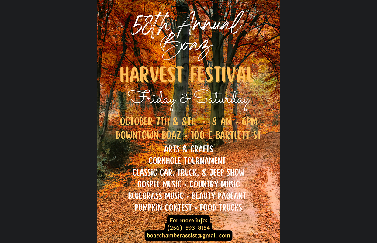Set for Oct. 7-8, the Harvest Festival invites everyone to downtown Boaz for two days of family-friendly fun including live music, arts and crafts, contests, car show, beauty pageant and more.