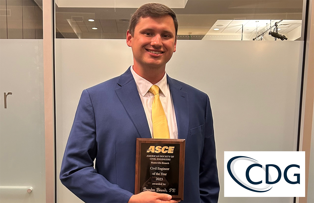 HUNTSVILLE — Brandon Bounds, a member of CDG’s geotechnical practice, won the 2023 American Society of Civil Engineers Huntsville Branch Civil Engineer of the Year award at the Engineer of the Year awards.