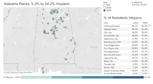 Near Birmingham, Hispanic communities along the Interstate 65 corridor in Hoover, Pelham, and Alabaster total over 10,000. Out of 597 Alabama cities, towns, and places, 450 saw either flat or increases in the Hispanic population. Among Alabama cities above 20,000 in population, only two, Hoover and Homewood, saw a decline in their Hispanic populations over the decade. Homewood was down by 417, Hoover by 211.