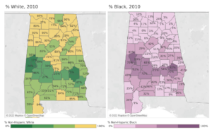 The counties with the most significant decline in the number of residents identifying as Non-Hispanic White were Mobile (-17,201), Jefferson (-15,961), and Montgomery (-14,745). Remember that some of that “decline” in the count may be attributed to individuals reclassifying themselves. However, those population changes in the white population correspond with overall population counts and flows that show continuing movement to suburbs located in adjacent counties.