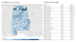 Secondary concentrations are evident in Tuscaloosa and Pickens counties and in southeast Alabama’s Wiregrass region, the report said. Those are also coincidental with poultry industry concentrations. Higher percentages of Hispanics can also be found in Shelby, Madison, Baldwin, Lee, and Limestone counties, where residential and commercial construction jobs are plentiful.