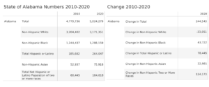 Nationally, the non-Hispanic “White alone” population decreased by 5 million or 2.6% from 2010 to 2020. In Alabama, that population declined by 33,000, from 3.20 million to 3.17 million.