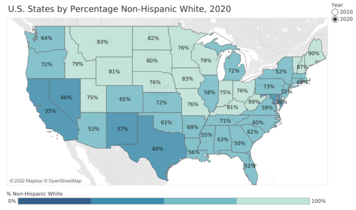 Meanwhile, the number of people identifying as non-Hispanic and of more than one race far exceeded the increase in any other category, 124,173, compared to the 78,445 increase in the Hispanic population, the second fastest growing group. The number of non-Hispanic residents who reported themselves as White in combination with another race rose by 118,249, a 222% increase, from 53,260 to 171,509, from 1.2% of the population to 3.6%.