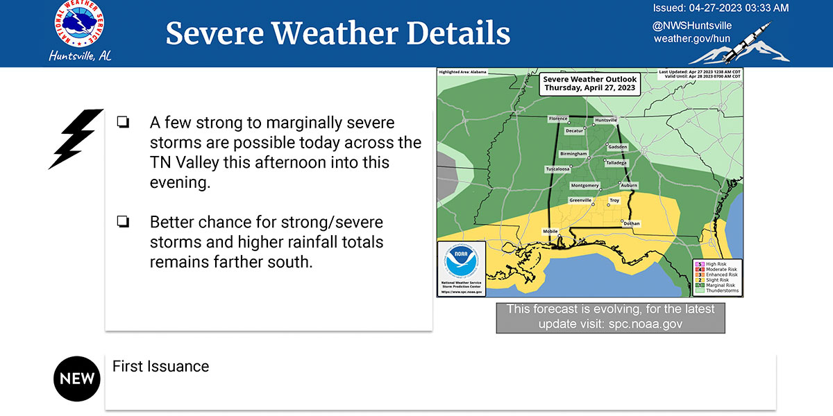 However, the Huntsville office said a few strong to marginally severe storms are possible across the Tennessee Valley this afternoon and into the evening.