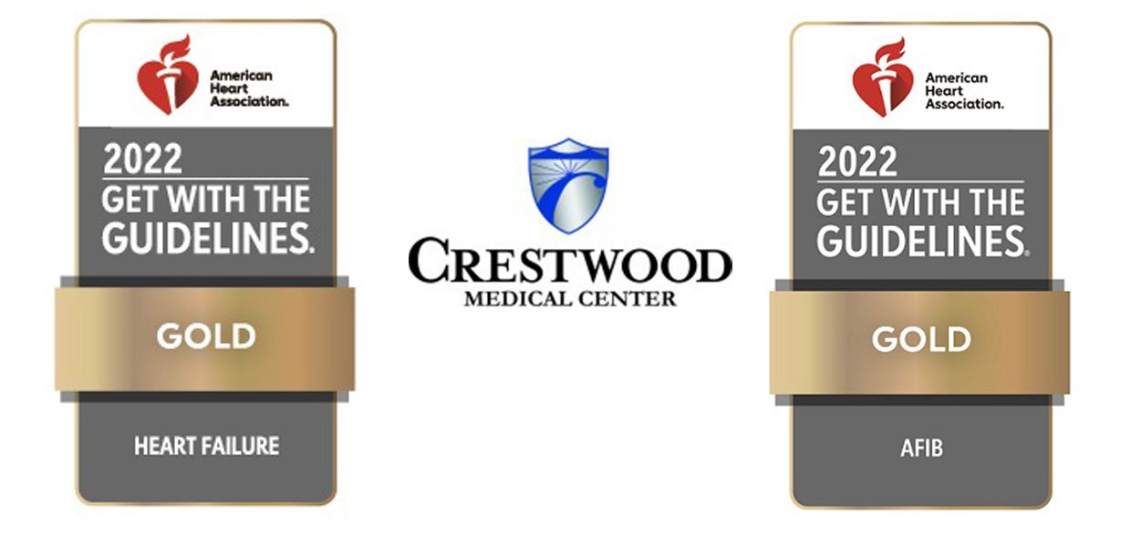 Crestwood Medical Center received two American Heart Association “Get with The Guidelines” awards for demonstrating a commitment to research-based guidelines for the treatment of heart disease. Crestwood won a gold award for the 2022 “Get with the Guidelines” Afib award and the 2022 “Get with the Guidelines” Heart Failure award.