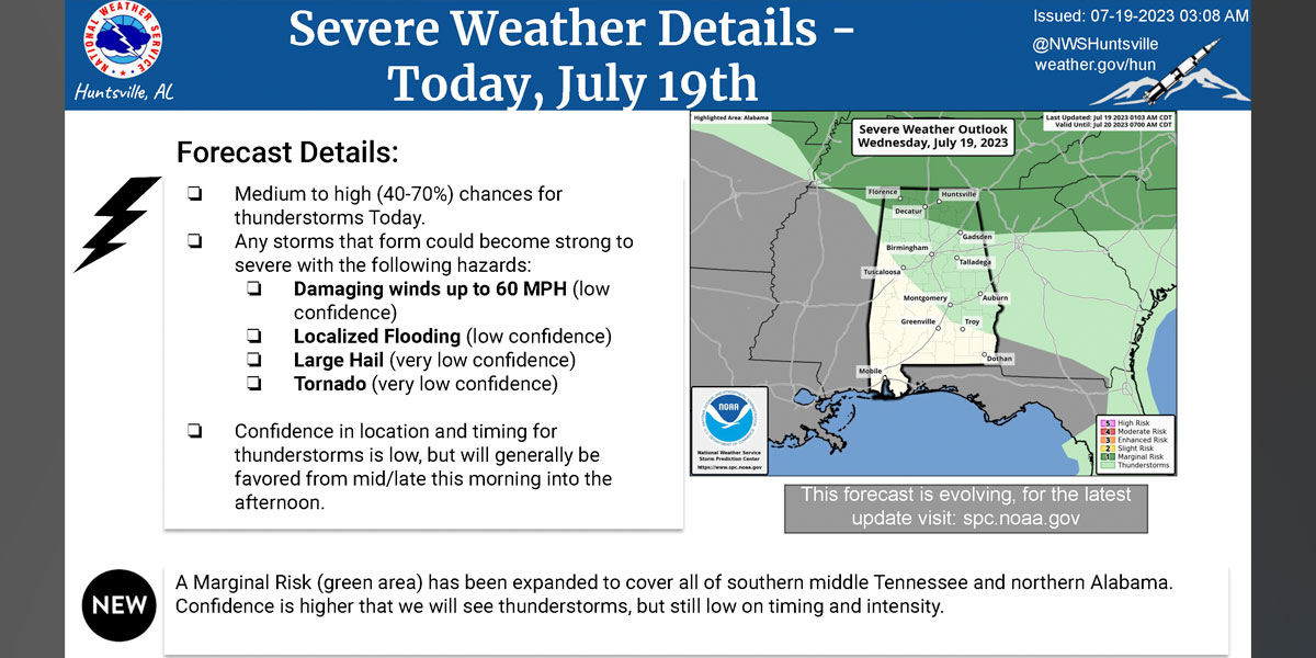 “We will remain in an active pattern the next three days, with chances for thunderstorms each day,” the National Weather Service’s Huntsville office said. “Some of these storms could be strong to severe.”