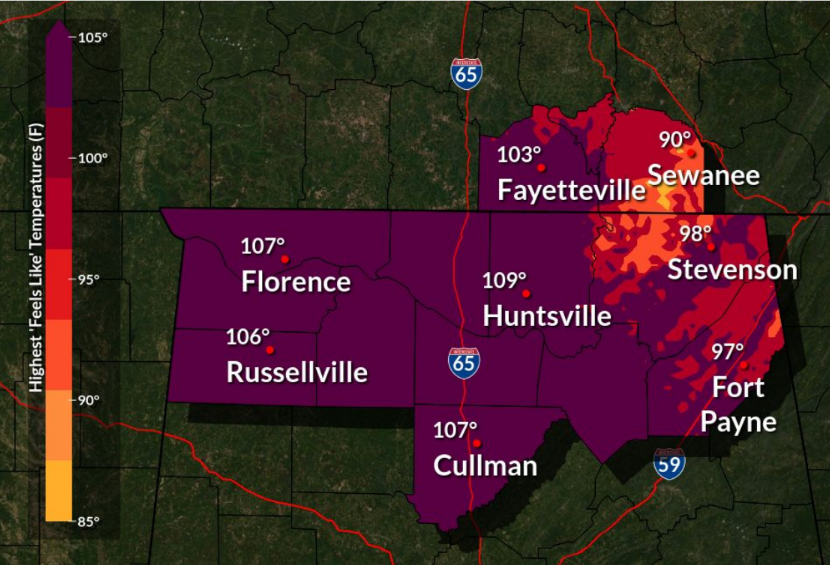 Maximum heat index values are expected to be between 105 and 109 degrees, according to the National Weather Service Huntsville office.