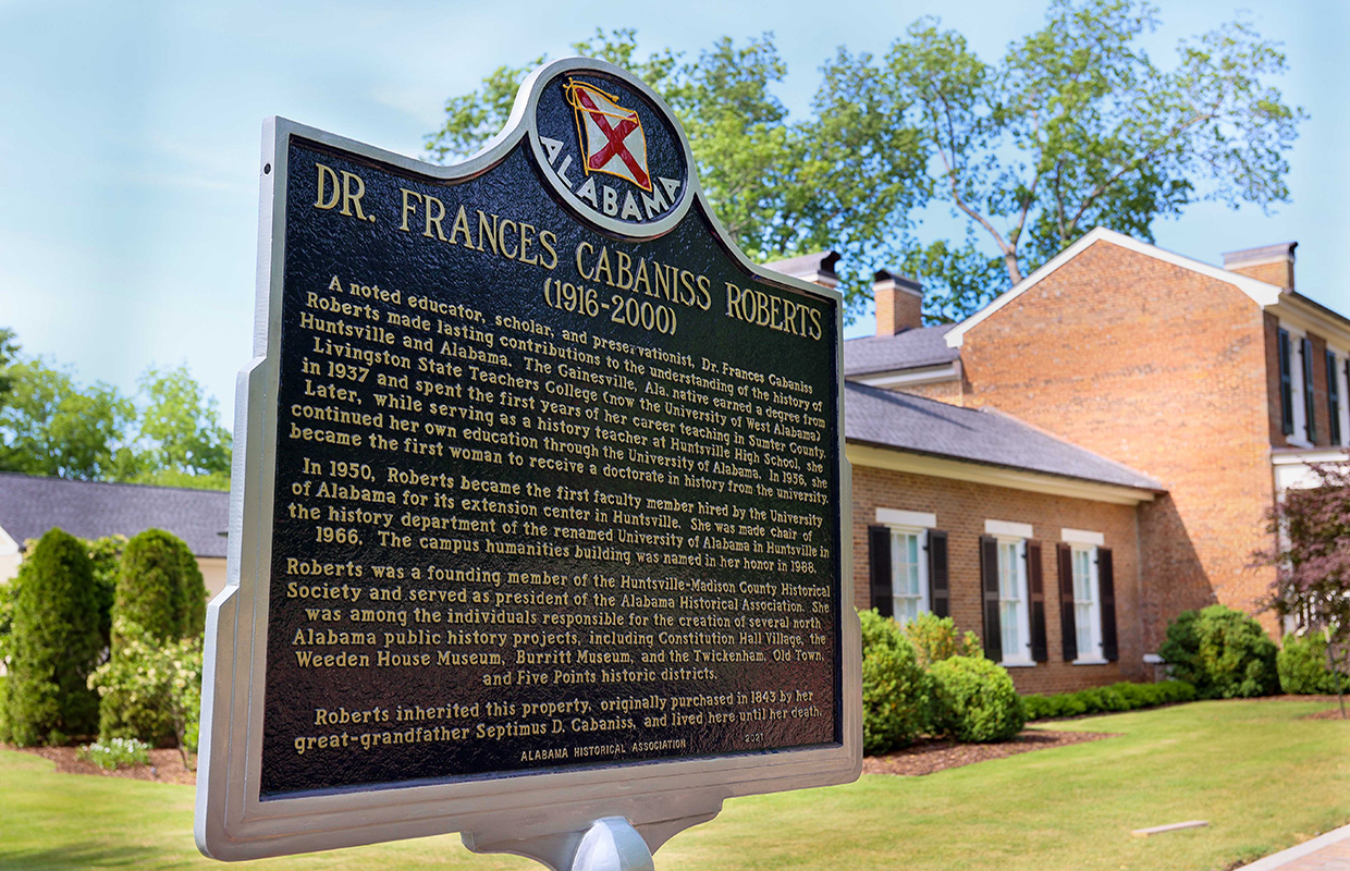 In 1978, Roberts received the Alabama Award of Merit for Outstanding Service in the Preservation of Alabama History. UAH dedicated the Humanities Building on campus in her honor, naming it Roberts Hall in 1988. The Alabama Women’s Hall of Fame inducted her into their ranks in 2013. To further honor her legacy, UAH faculty and students created a traveling exhibit, “Dr. Frances C. Roberts: Her Life and Legacy.”