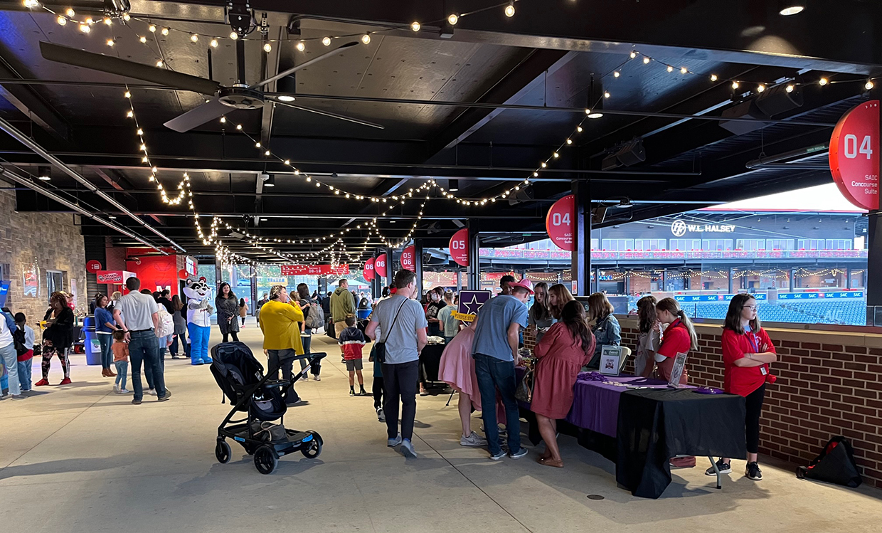MADISON – The moon beckoned Friday night over Toyota Field as students showcased their activities and local businesses lined the concourse; the aroma of hotdogs, ice cream and sudsy draft beer wafted on the dusky breeze, while Rocket City Trash Pandas’ mascot Sprocket high-fived kids donning colorful balloon headdresses.