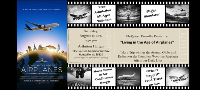 The Aug. 13 event will feature a showing of “Living in the Age of Airplanes” in the air-conditioned Avilution hanger at Huntsville International airport as well as additional activities. It all starts at 7:30 p.m.