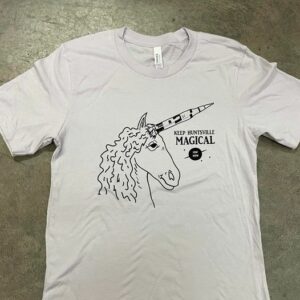 As Fowler realized with that he “had no idea how to print shirts” with his “locAL” design —meant to highlight his favorite local businesses, he carried this playful ideology with him as he signed up for a screen-printing class at Lowe Mill. The “Keep Huntsville Magical” unicorn design drew the attention of the Green Pea Press instructors with Green Pea Press who encouraged Fowler to sell his designs at their venue.