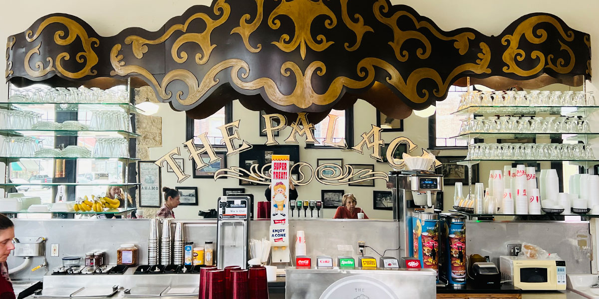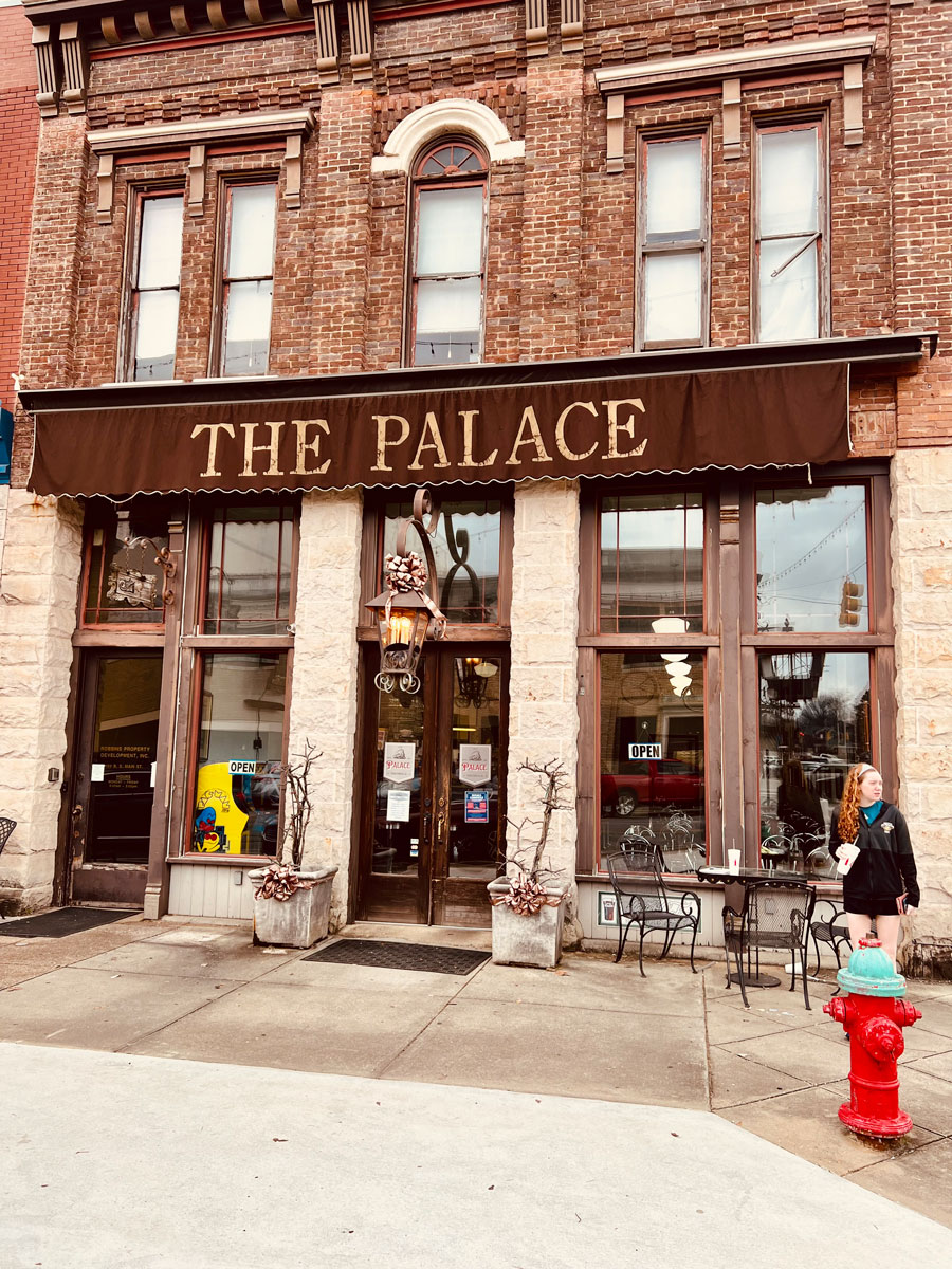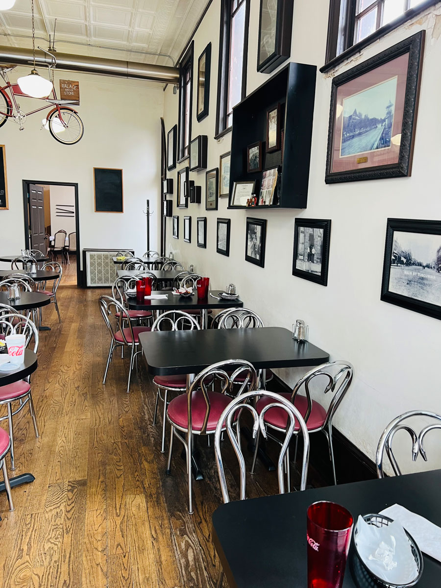 When you step into The Palace you notice the old-time ice cream shop tables and chairs, a black countertop where customers can enjoy their meals on barstools, a mirrored wall behind the counter, and five tall windows that offer views of Main and Fifth streets.