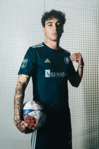 The deep blue color of the kit is shared with parent club Nashville SC. The iconic “N” monogram and soundwave of Nashville SC spears above the player’s name on the back.