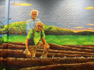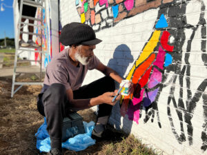 The mural depicts Bill Giardini, a longtime volunteer nicknamed “Mr. Habitat,” planting a seed in the ground. The seed pops out of the ground as confetti to symbolize all the activities and home construction projects happening at Habitat.