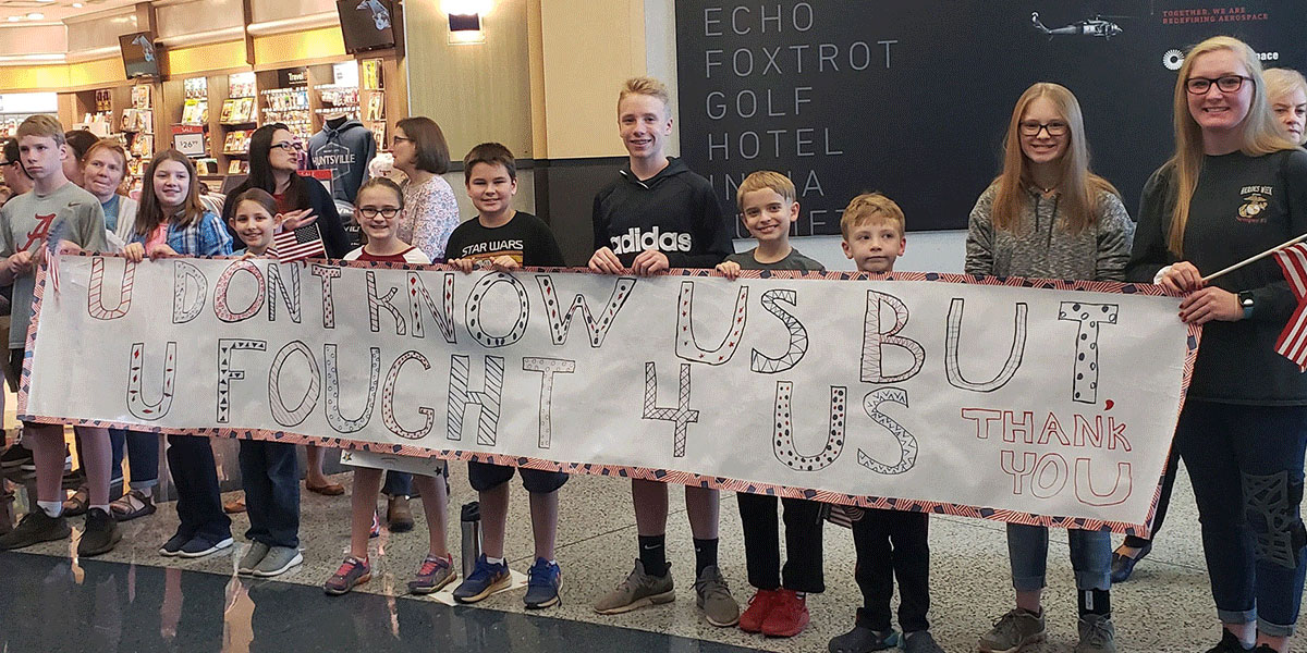 Those attending are asked to wear patriotic colors and bring U.S. flags and welcome signs to the public waiting lobby on the second floor of Huntsville International Airport. The lobby is adjacent to the TSA checkpoint area. Participants are not permitted to enter the secure gate area behind TSA.