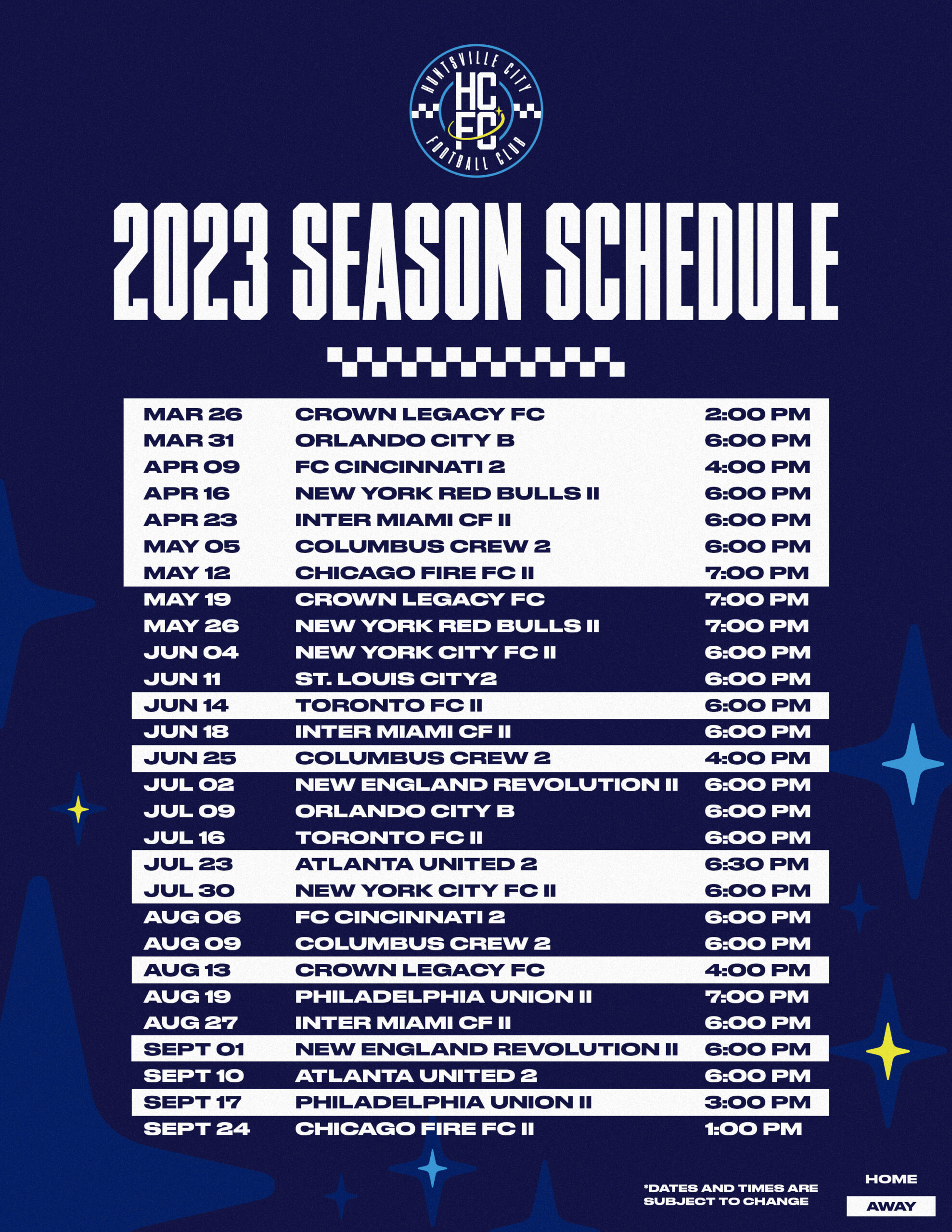The season kicks off March 26 at Crown Legacy FC, starting a slate of seven straight road matches and a bye week before returning home.