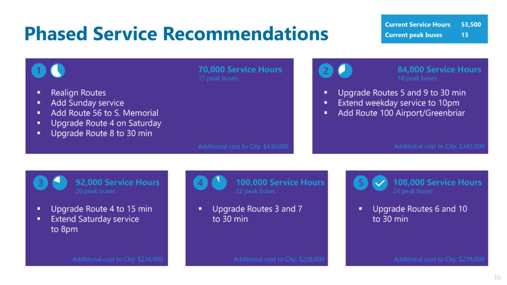 Each phase of the plan recommends adding buses to meet peak ridership needs. At full implementation, the new plan requires 24 peak buses.