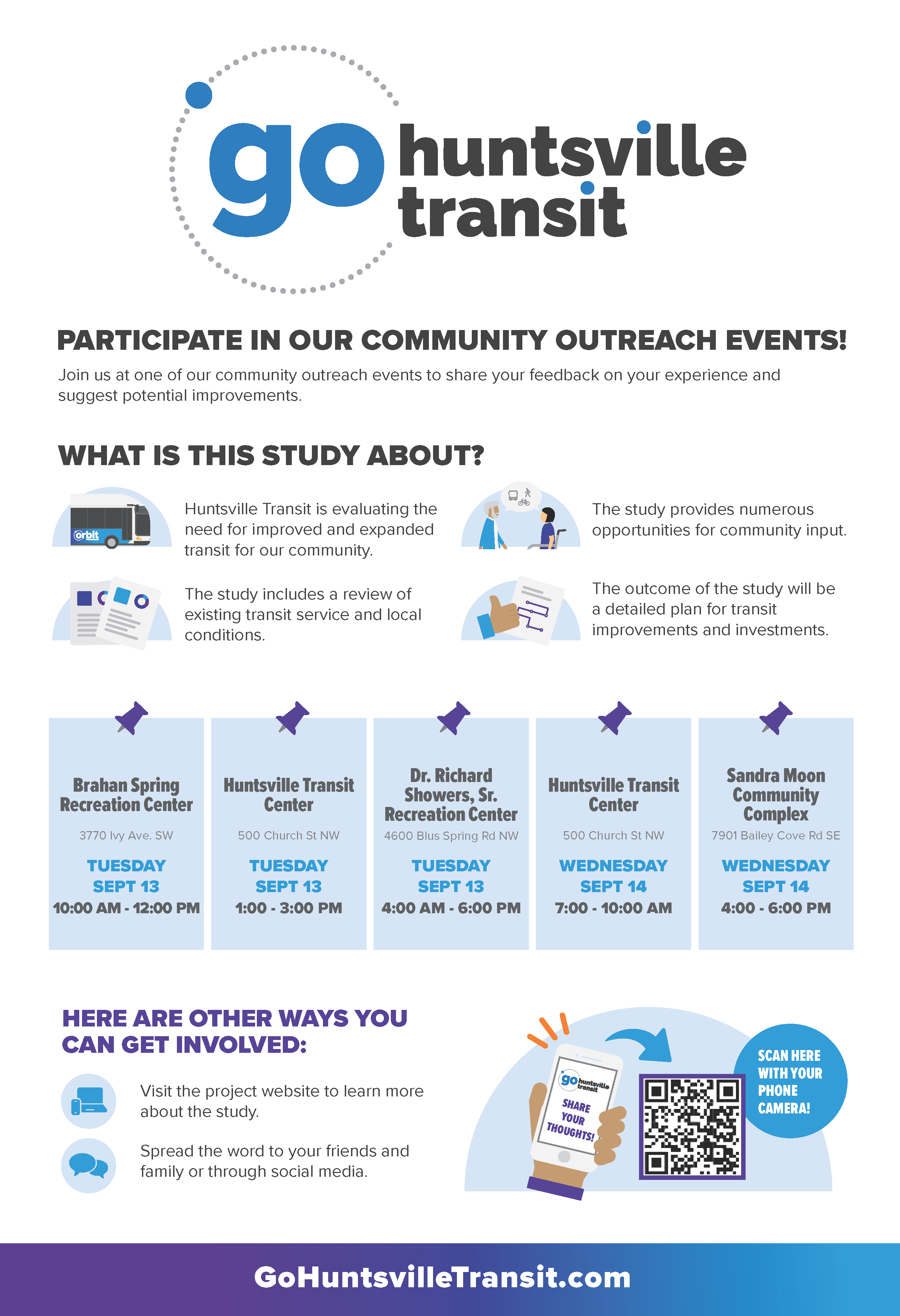 “Receiving public input is such a critical part of what we do because it not only guides what we do now, but it also shapes our future,” said Quisha Bryant, director of Huntsville’s Parking and Public Transportation Department. “We hope to receive insight on not only our challenges, but also our successes.