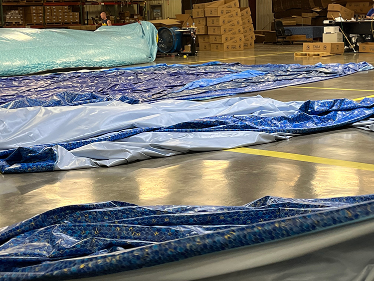 But just within this past year, Plant Manager Kevin Summerford perfected an idea he has had for the past three years: Use leftover decorative vinyl liner material to make the biggest, sturdiest and most luxurious lake and pool floats available on the market.