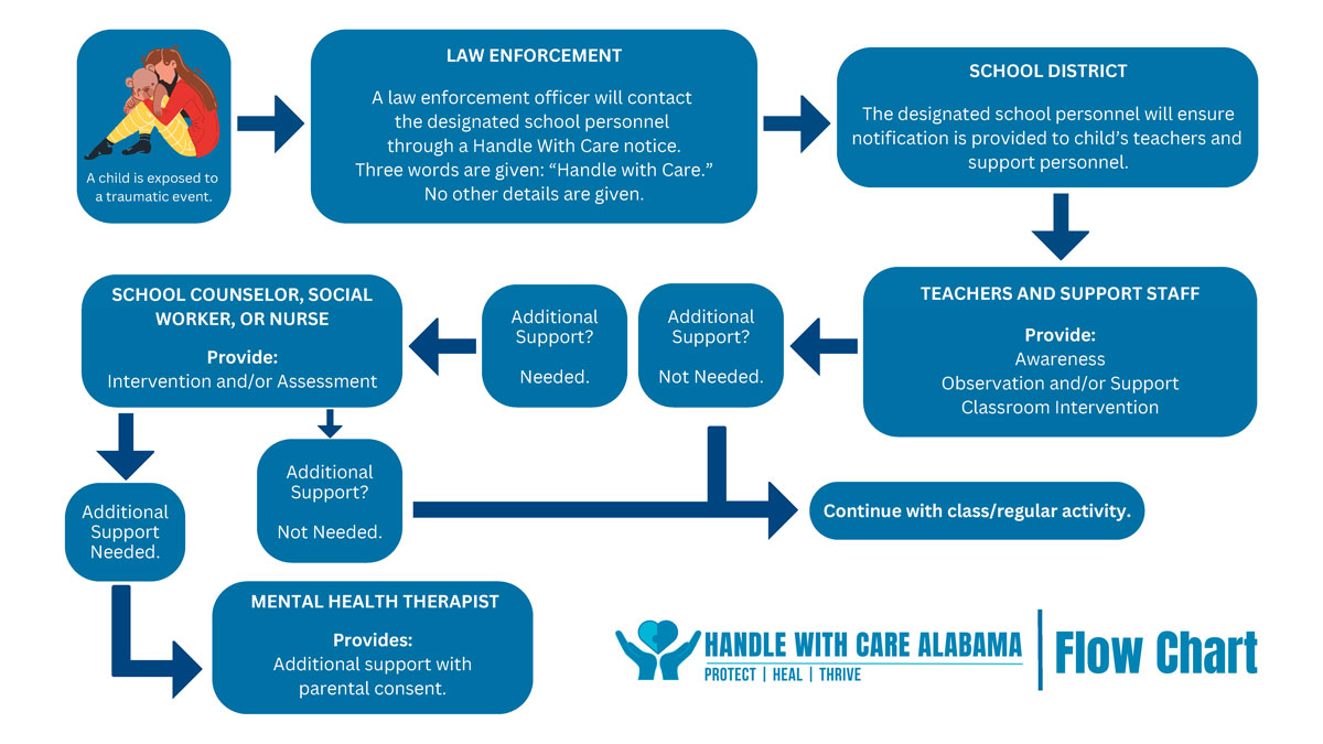 Now, to help educators deal with the situations, the National Children’s Advocacy Center, Madison City Schools, and Madison Police and Fire departments have created the state’s first Handle With Care program. This collaborative effort provides trauma-informed support and care to children who have experienced traumatic events.