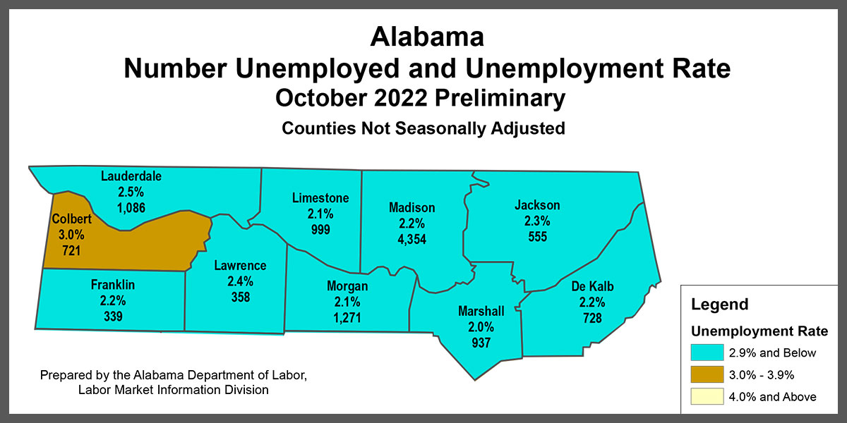 Madison County’s rate was 2.2%, which is unchanged from September and last October; DeKalb County had a 2.2% rate last month, unchanged from September but lower than last October’s 2.3%. Franklin County also had a 2.2% unemployment rate in October, but it was up from September’s 2.1% and 2% a year ago.