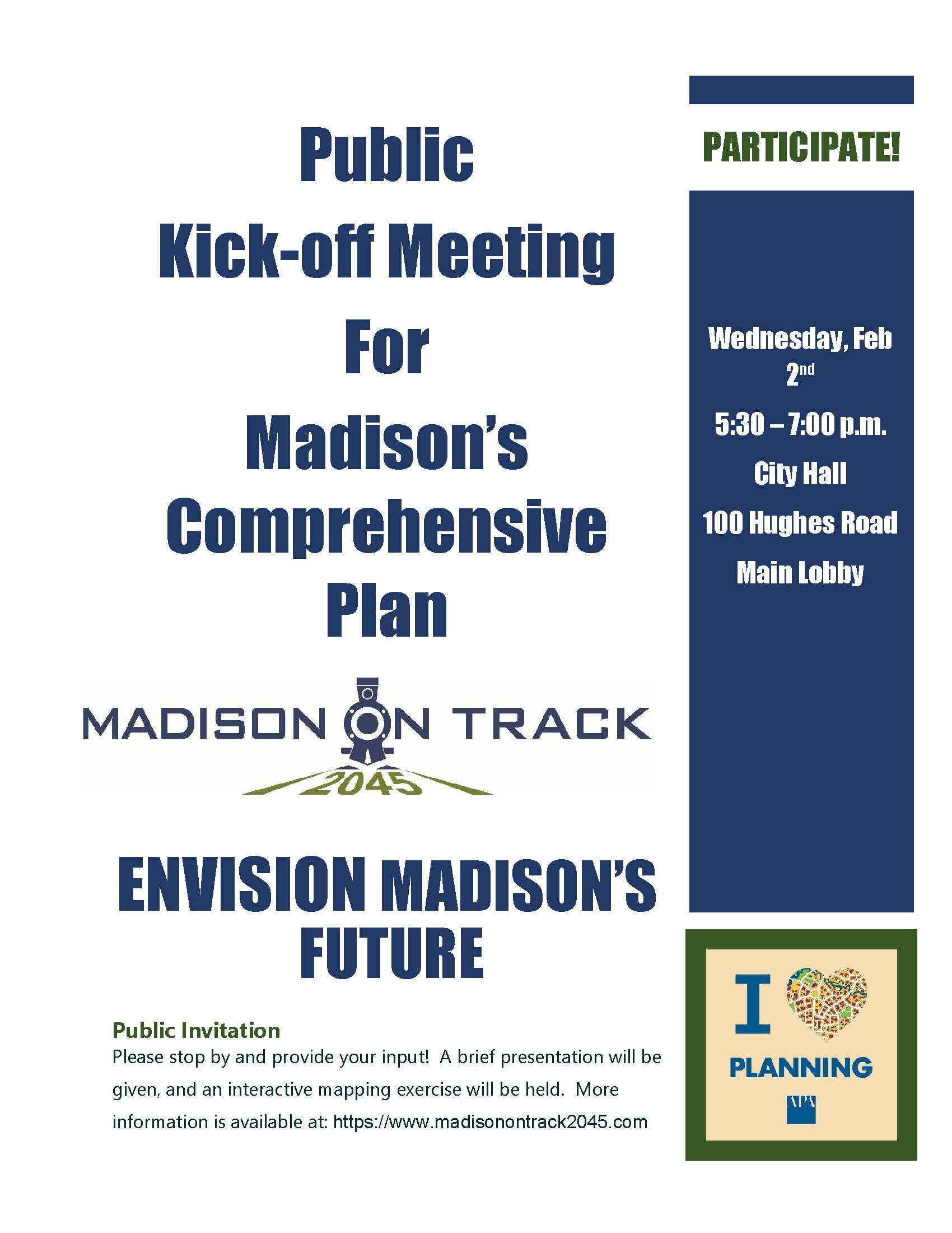 The public is invited, even encouraged to drop by the first community-based planning effort to shape the future of the City of Madison through an update to the city’s Comprehensive Plan. Known as “Madison On Track 2045,” there will be a brief presentation followed by an interactive mapping exercise in the main lobby of City Hall at 100 Hughes Road, Wednesday, February 2, from 5:30 until 7:00 p.m.