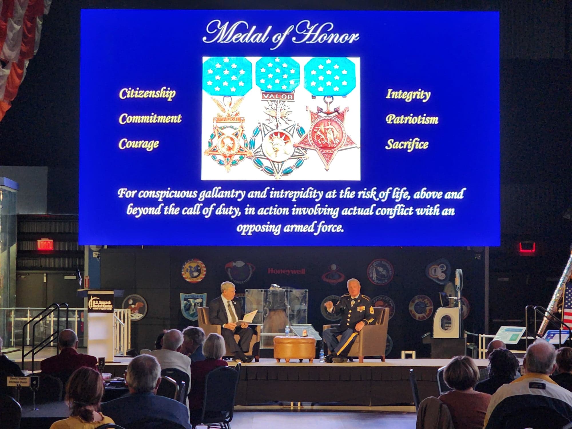 The event, in the Davidson Center at the U.S. Space & Rocket Center, featured an interview with Davis and Robert F. Jerome, who has made it his mission to honor living Medal of Honor recipients and to share their stories. It was presented by Merrill Lynch in Huntsville and organized by Senior Resident Director David Staley.