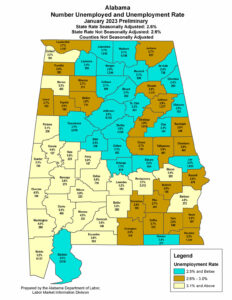 MONTGOMERY – The state unemployment rate for January was 2.6%, Gov. Kay Ivey announced today. The preliminary, seasonally adjusted January unemployment rate is unchanged from December 2022’s revised rate, and also unchanged from January 2022’s rate.