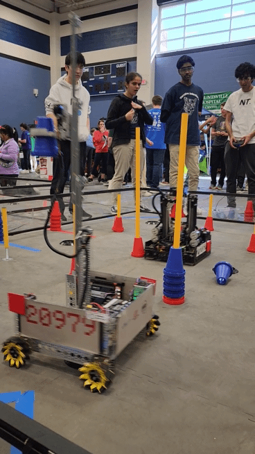 The competing teams are challenged to design and build a robot using a kit of parts to compete against each other in sophisticated field game. The robot must run for three minutes and has specific tasks to do. Agnew says teams don’t know the task beforehand, and compared it to a “big tic tac toe game” of moving cones across the field in a line.