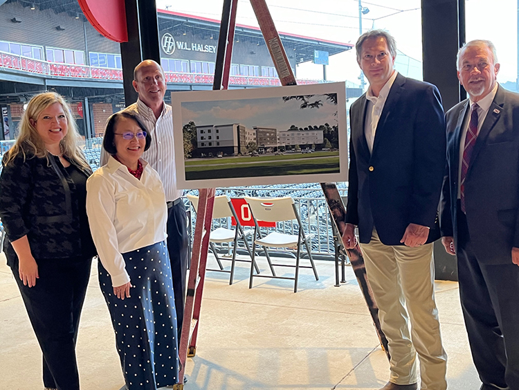 The Madison Chamber of Commerce presided over the ceremony, hosting Chris Chavis, president of PHD Hotels who is building the Homewood Suites; Town Madison developer Louis Breland, founder of the Breland Companies; Madison Mayor Paul Finley; and Madison County Commission Chairman Mac McCutcheon in welcoming Homewood Suites to the neighborhood.