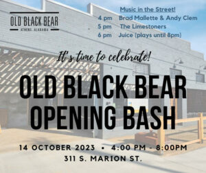 “With the Old Black Bear Opening Bash, we are celebrating the addition of this great new restaurant to downtown Athens and the extension of the Entertainment District to include them,” said Athens Main Street Executive Director Tere Richardson. “Come out on Saturday … to listen to great local music and help us celebrate.”