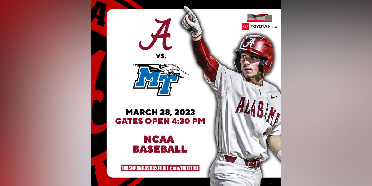 The home of the Rocket City Trash Pandas will host Alabama taking on Middle Tennessee State Blue Raiders on March 28. The matchup marks the first journey to Madison for the Alabama baseball team and will be the third SEC baseball game in Toyota Field history, with the first two being hosted by Auburn.