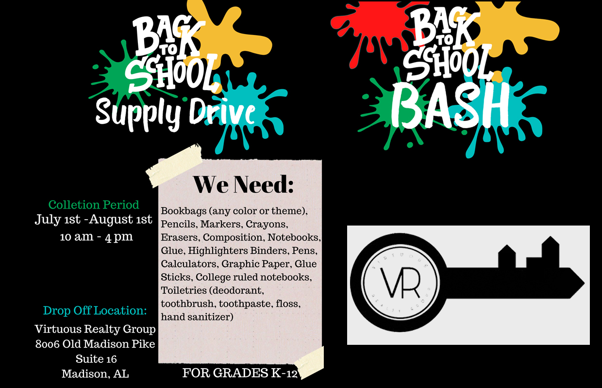 MADISON — The deadline is near for the Virtuous Realty Group Back to School Supply Drive. The campaign, which ends Aug. 1, aims to collect enough school supplies to fill 100 book bags for K-12 school children in Madison.