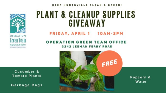 “Keep Huntsville clean and green!” Drive through at the Operation Green Team office (3242 Leeman Ferry Road) on Friday, April 1 from 10 a.m.-2 p.m. to get your free cucumber and tomato plants. Garbage bags to use for cleanups will also be available, along with popcorn and water.