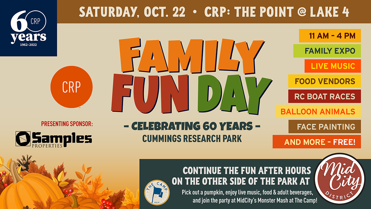 Cummings Research Park’s 60th anniversary Family Fun Day starts at The Point at Lake 4 off Explorer Boulevard across from Adtran’s south entrance.