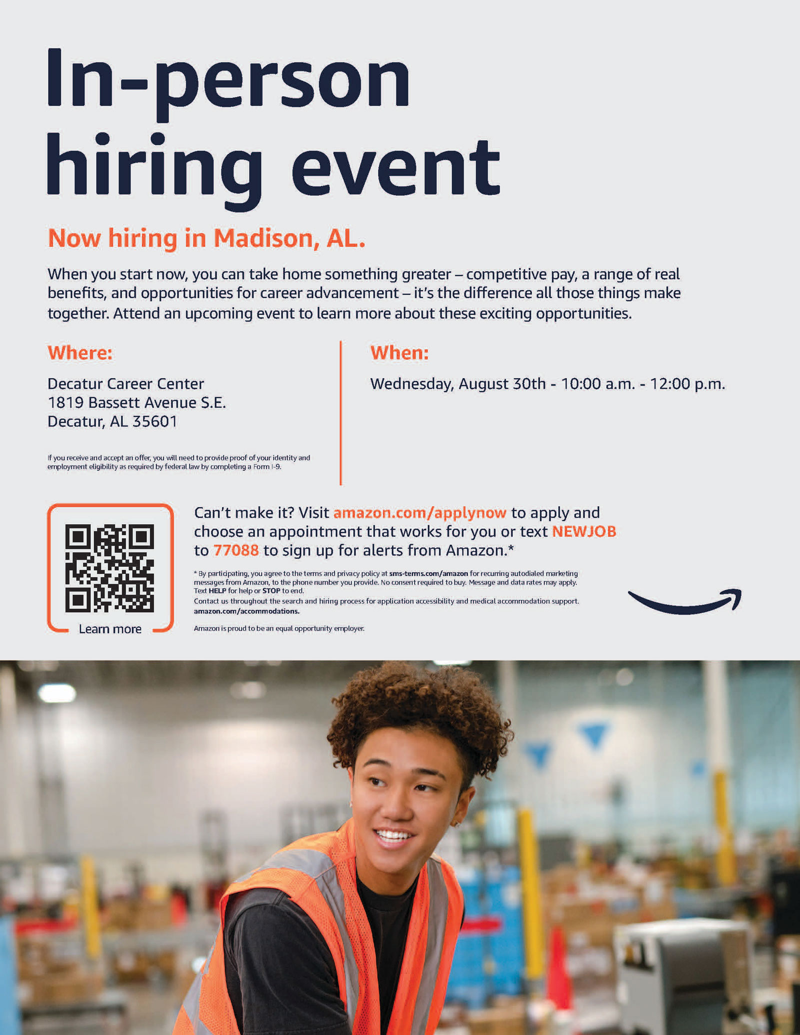 To pre-apply, visit www.amazon.com/applynow. Interviews will be conducted onsite at the Decatur Career Center. For information, call 256-544-0142 ext. 853011
