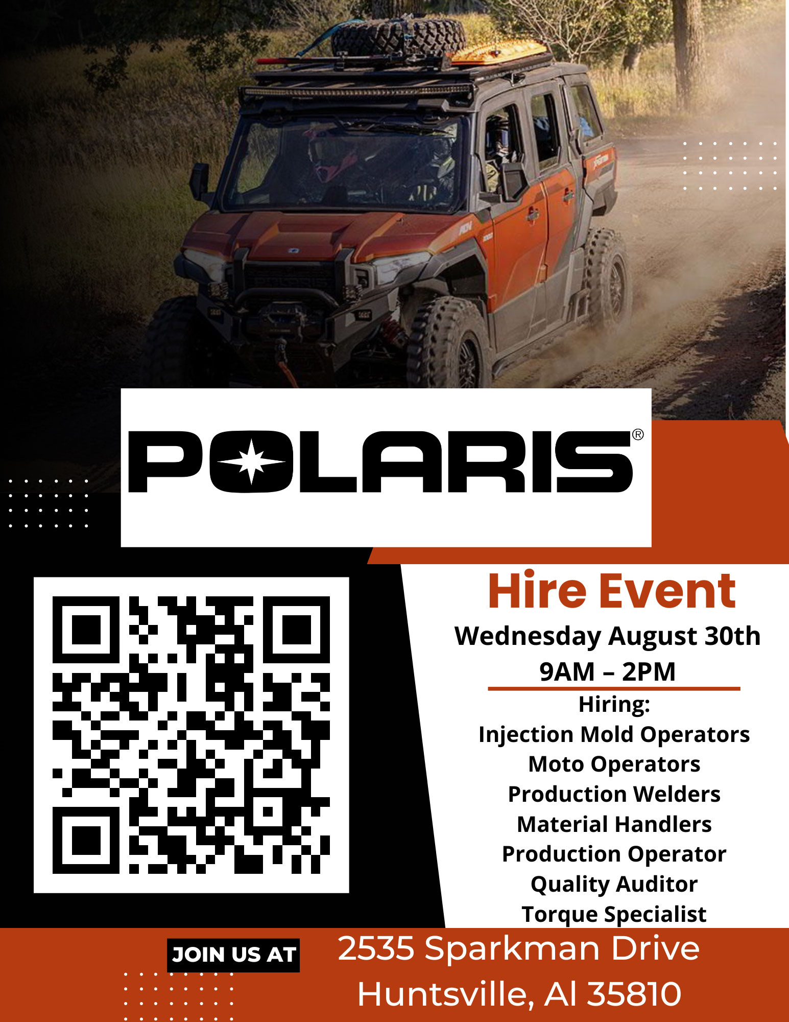 The Huntsville job fair for Polaris is at the Huntsville Career Center, 2535 Sparkman Drive. The job fair is 9 a.m. to 2 p.m. on Aug. 30. For information, call 256-851-0537.
