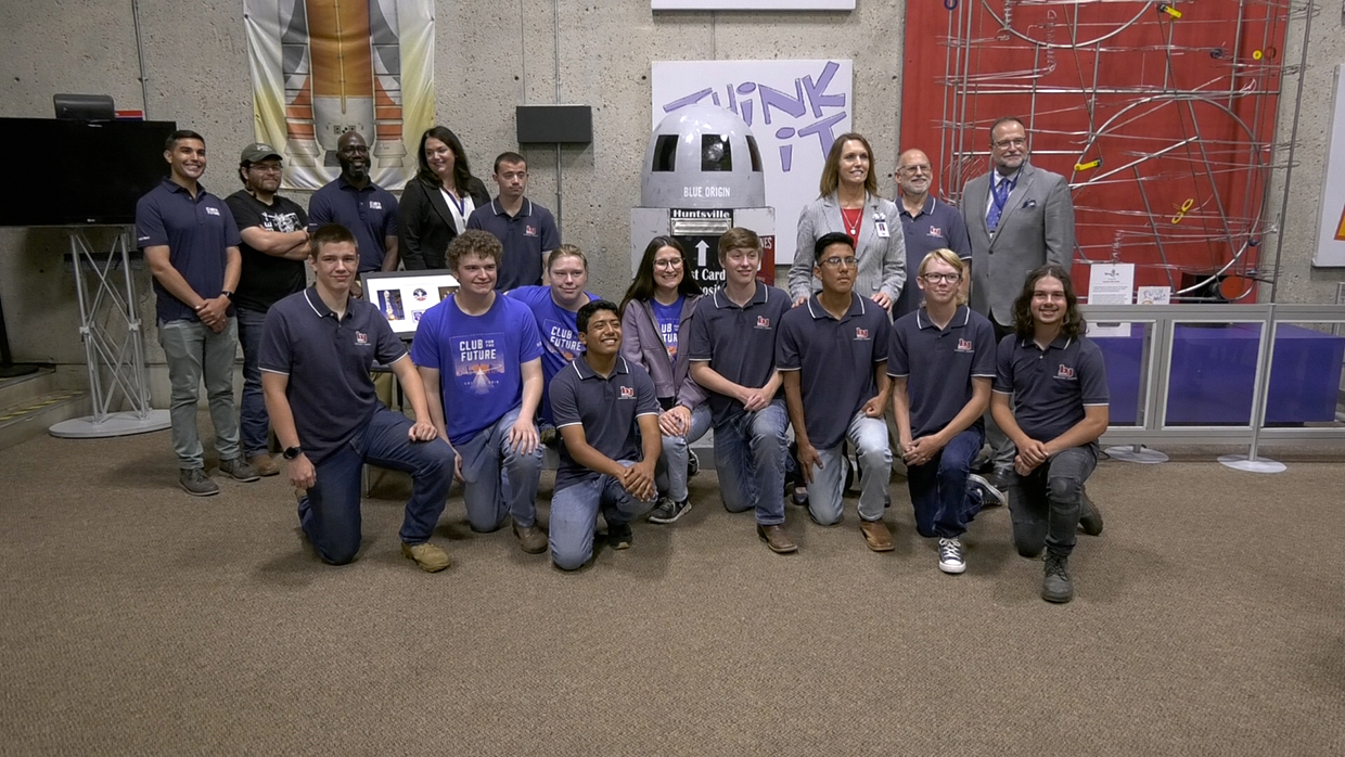 Last week, the foundation, Madison City Schools and the rocket center unveiled a six-foot-tall, rocket-shaped postbox. It was designed and built by students in Bob Jones High School’s Construction Academy. Blue Origin engineers Armando Gonzalez-Feuchter and Larry Powell supervised the construction.