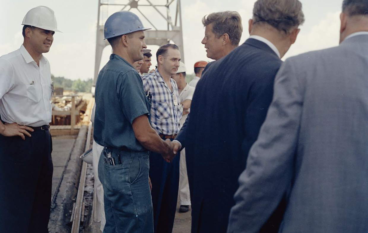 Perhaps the most famous visits to Huntsville was when President Dwight Eisenhower spoke at the dedication of the Marshall Space Flight Center in 1960; and President John F. Kennedy on two occasions in 1962 and again in 1963, just weeks before he was tragically shot, both times in support of the space program at Marshall Space Flight Center. He reassured his commitment to putting Americans on the moon and he joined Dr. Wernher von Braun and his team of rocket scientists on a tour of MSFC.