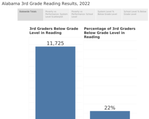The 2022 results represent a slight improvement over 2021, when 23% of students scored below grade level on the reading portion of the Alabama Comprehensive Assessment Program (ACAP), the statewide standardized test administered each spring.