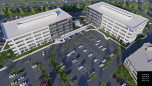 The two-building campus will include a 144,000-square-foot parking garage and is scheduled to be completed in the second half of 2022.
