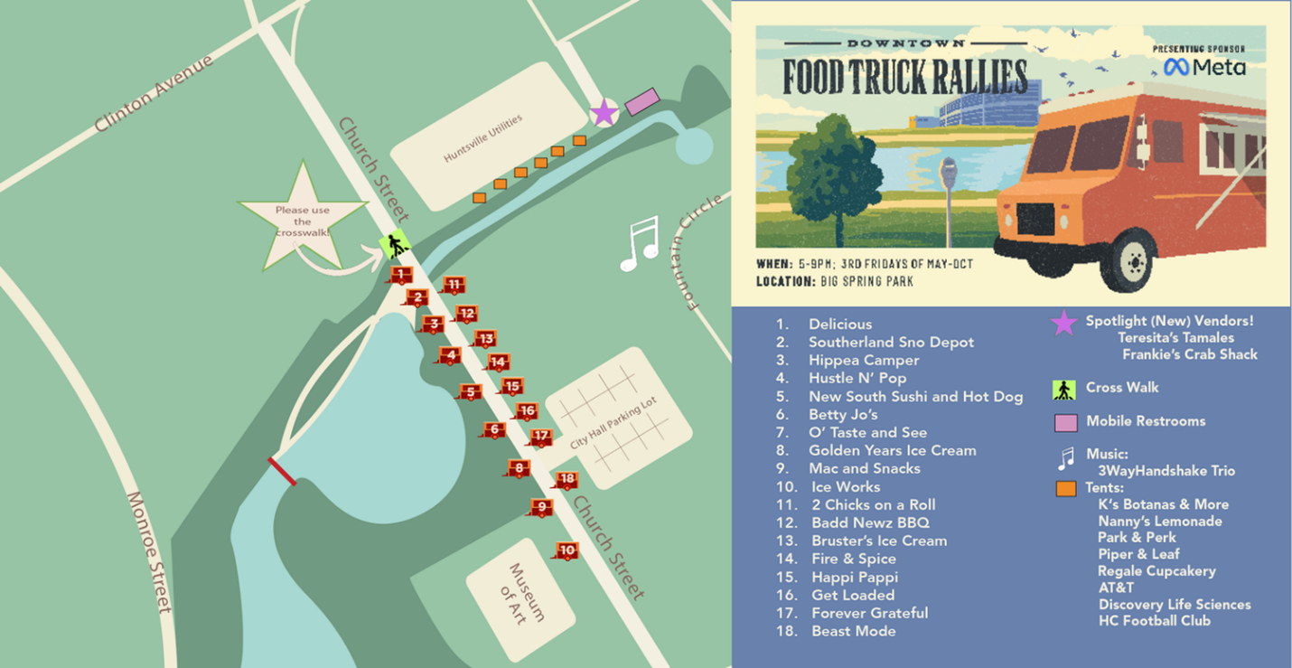 Sponsored by Meta, the Food Truck Rallies are one of Huntsville’s largest and favorite events with more than a dozen rolling diners all spread out across the park at the same time.