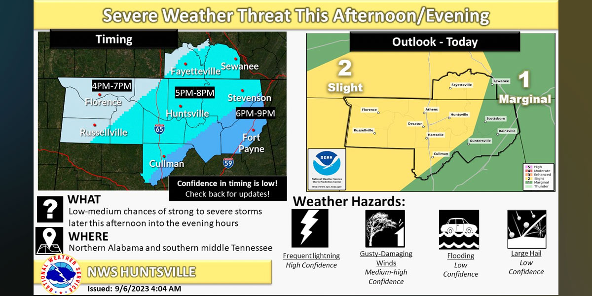 HUNTSVILLE — Strong to severe storms are possible throughout the Tennessee Valley this afternoon into the evening hours, according to the National Weather Service Huntsville office.