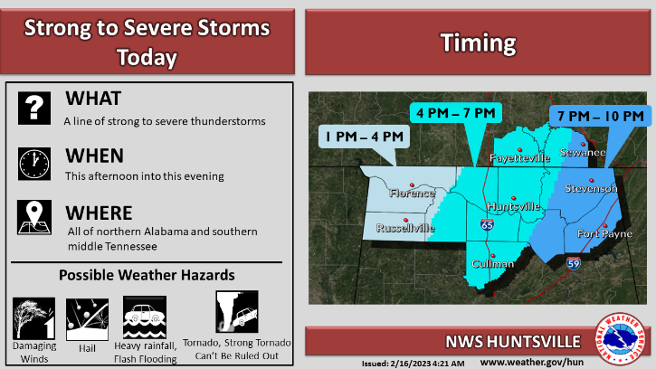 “A line of strong to severe storms will move through the Tennessee Valley today, during the afternoon into this evening,” the National Weather Service’s Huntsville office said. “Storms will be capable of producing heavy rainfall that could lead to flash flooding, damaging winds, hail, and a tornado (a strong tornado cannot be ruled out).”