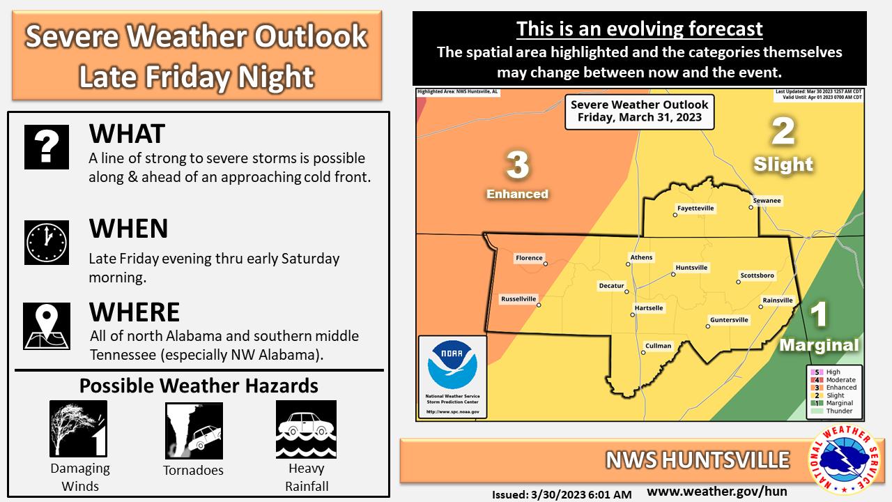 “A line of strong to severe thunderstorms is expected to sweep eastward through the Tennessee Valley late Friday evening through early Saturday morning,” the office said today. “Damaging winds and tornadoes are the main threats (especially for northwest Alabama). Locally heavy rainfall and hail are secondary threats with this line of storms.”