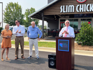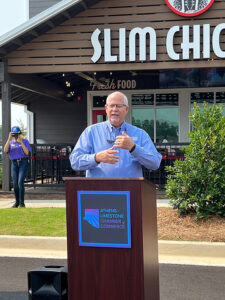 “When my partner Dana Price and I initially opened the three Slim Chickens in Madison County because that’s how Slim’s corporate wanted to lay it out, we always knew once we left the Huntsville market, Athens was the city we were destined to go to first…,” Renfroe said while interrupted by cheers. “…and our territory goes all the way to Mobile Bay, so we could have gone anywhere in the state.